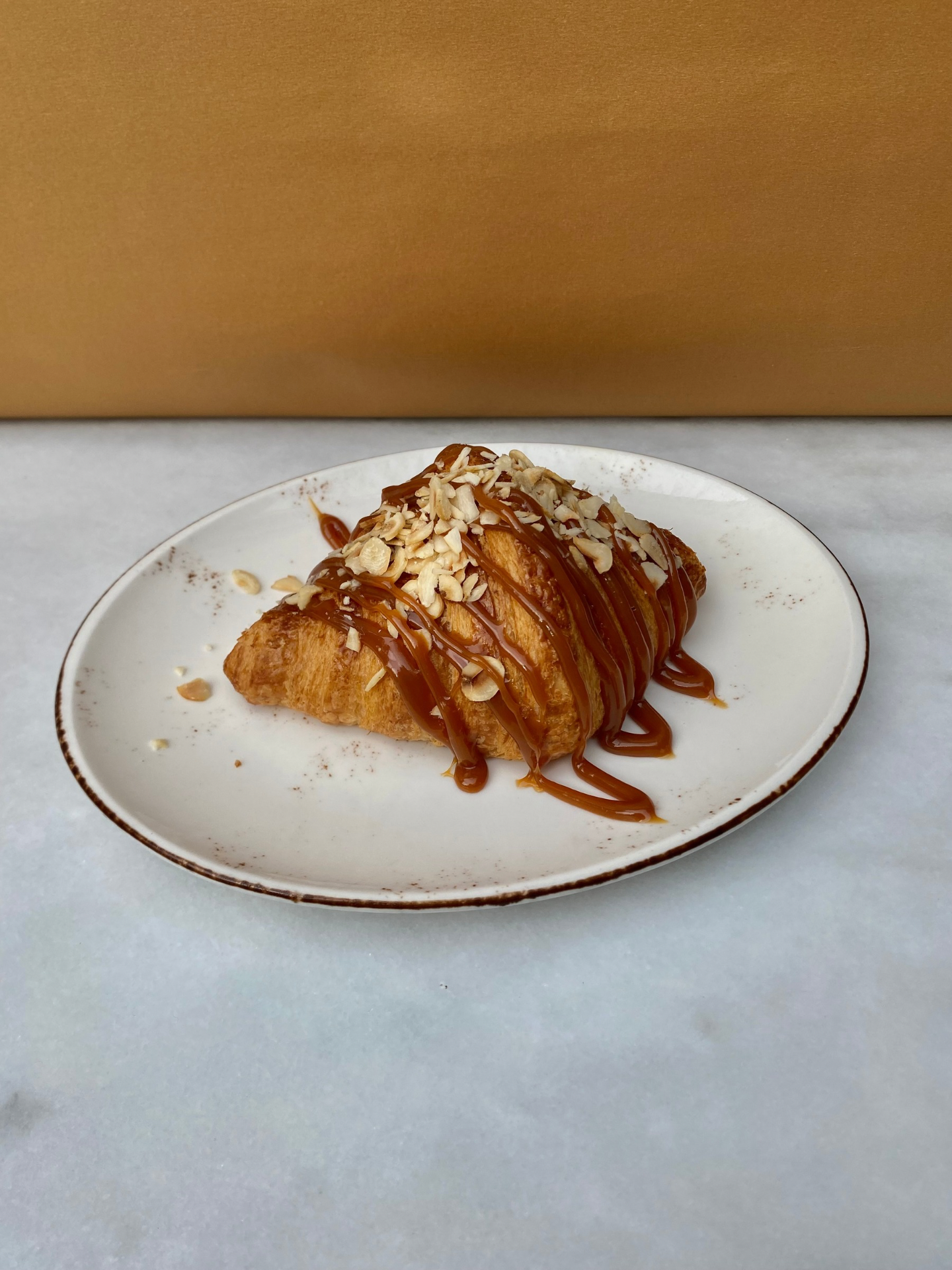 Сочный круассан с нежным яблочным соусом, щедро политый карамелью и украшенный хрустящим фундуком. Идеальное сочетание фруктовой свежести и сладкой карамели.